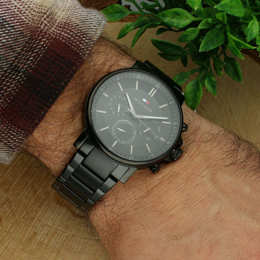 The sleek and stylish Tommy Hilfiger Tyson Chronograph Watch is the perfect accessory for any man. With a black dial and black steel strap, this watch exudes sophistication and class. The chronograph feature adds functionality, making it the ideal choice for both work and play.