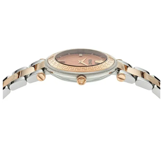 Versace GRECA REVE 35 mm VE8B00424 is an elegant luxury watch for women. The silver-colored stainless steel envelope is perfectly matched with the banquet, which is a combination of silver and rose gold, made of PVD-coated stainless steel. The rose-gold dial, decorated with Versace's characteristic pattern and the brand's golden symbol, highlights the watch's unique style. The watch is powered by a Swiss Made quartz movement and protected by sapphire glass for scratch resistance. With a water resistance of 5 ATM, the watch is resistant to minor splashes, combining elegance with functionality.